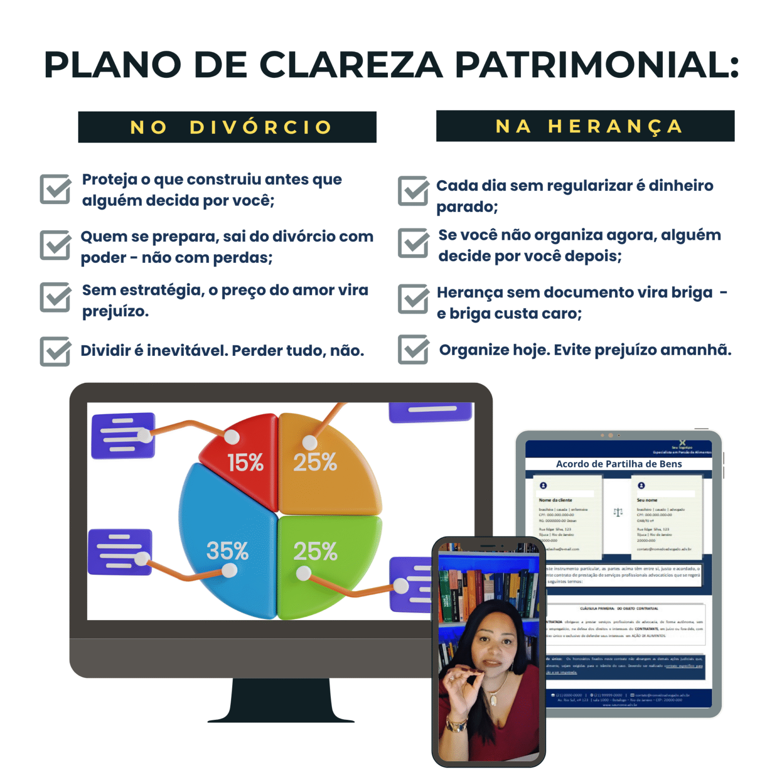 Foi desse compromisso em transformar medo em clareza e confusão em estratégia que nasceu o Plano de Clareza Patrimonial — uma ferramenta única para quem deseja resolver com consciência, proteger o que construiu e tomar decisões jurídicas com confiança.